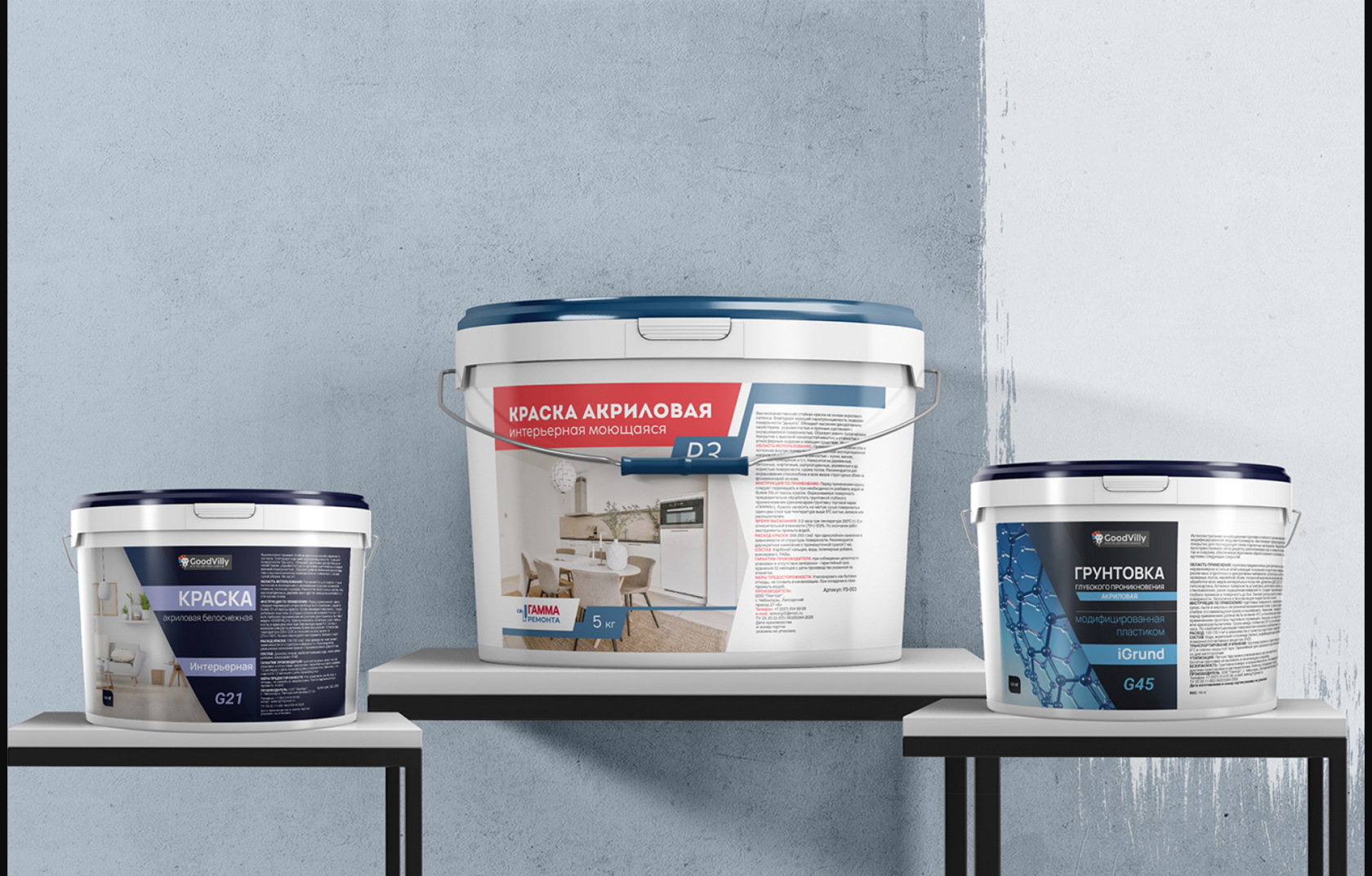 Готовые макеты — это коллаж из этикеток, где видно единство стиля, и 3D-визуализация банок на полке. Клиент отметил, что новый дизайн упаковки акриловой краски повысил узнаваемость бренда на 30% по внутренним тестам. Банки Gamma Remonta P3 и GoodWill G45 теперь выглядят премиально, несмотря на доступную цену.