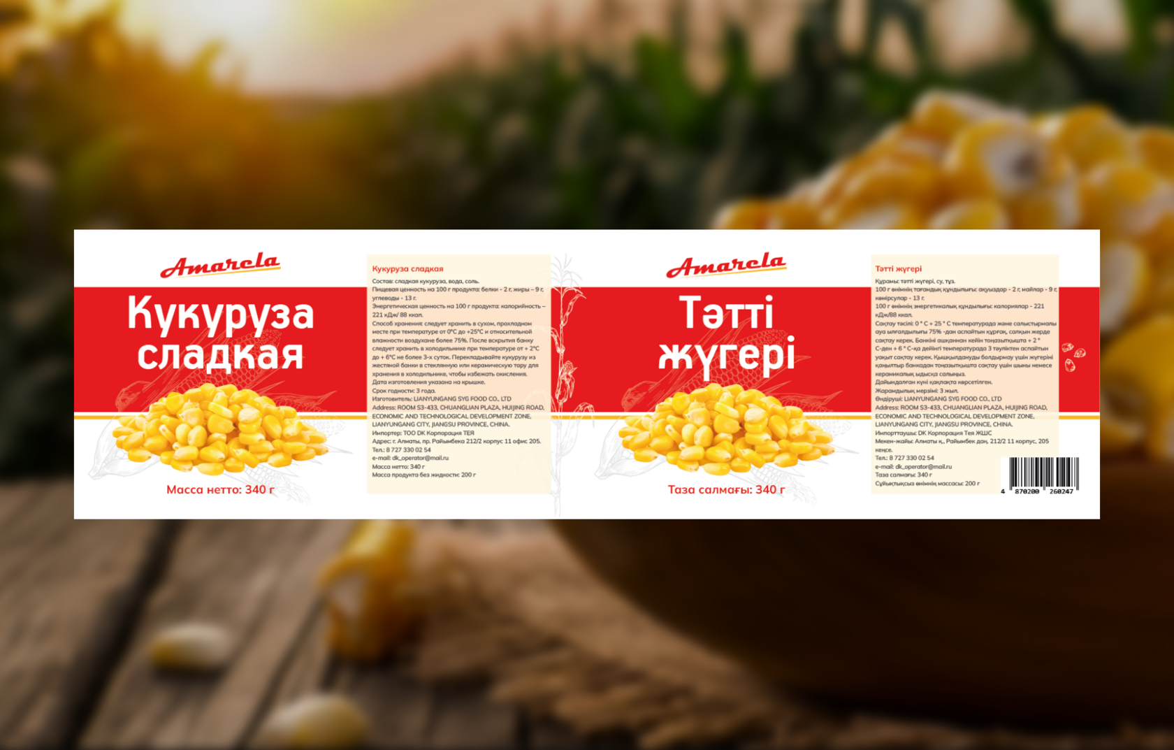 Логотип Amarela выполнен в золотистом оттенке с легким градиентом — это добавляет премиальности, но без излишеств. Мы применили модульную систему дизайна: левая часть этикетки фокусируется на названии продукта ("Кукуруза сладкая" на русском и "Тәтті жүгері" на казахском), справа — фото зерен кукурузы в высоком разрешении, чтобы покупатель "почувствовал" текстуру. Информационный блок размещен компактно: состав (100% натуральная кукуруза, вода, соль, сахар), условия хранения (от 0 до +25°C), адрес производителя в Китае и импортные данные.