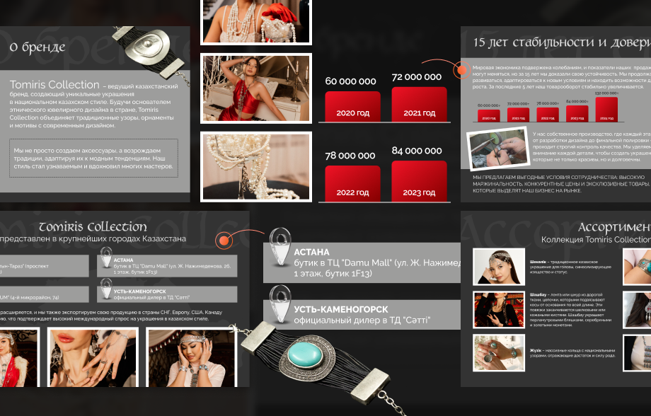 Проект был выполнен для Tomiris Collection — ювелирной марки, представленной на российском рынке. Основной задачей разработки презентации стало создание универсального инструмента, который бы не только демонстрировал ассортимент, но и транслировал философию бренда: синтез традиционного культурного кода и актуального дизайна. Презентация ориентировалась как на конечных потребителей, так и на потенциальных партнёров, дистрибьюторов и представителей индустрии моды и искусства.
