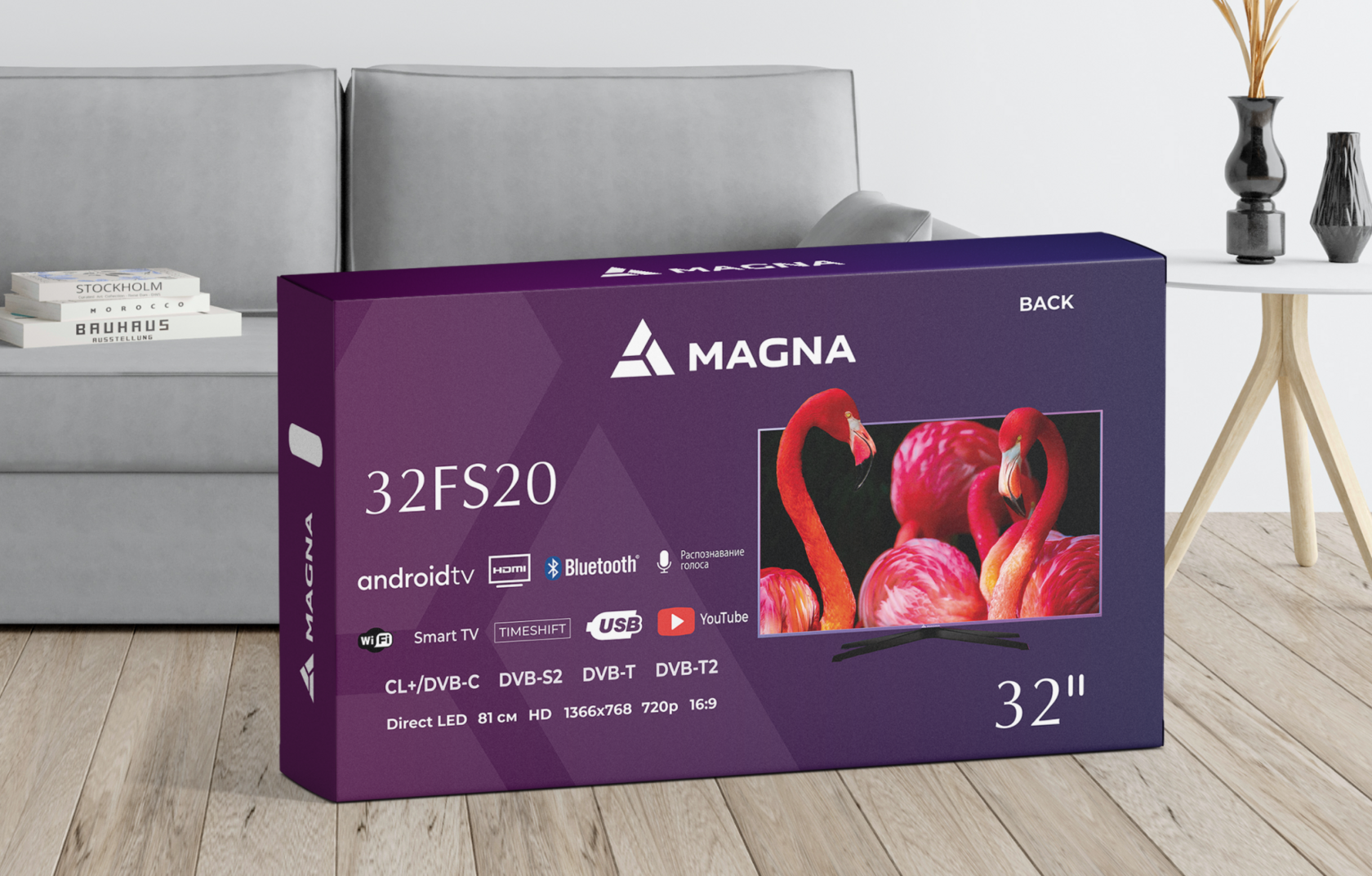 Дизайн системы упаковки адаптирован под разные диагонали телевизоров, сохраняя общий фирменный стиль. Это создаёт единую линейку, где каждая модель легко узнаваема как часть бренда MAGNA.