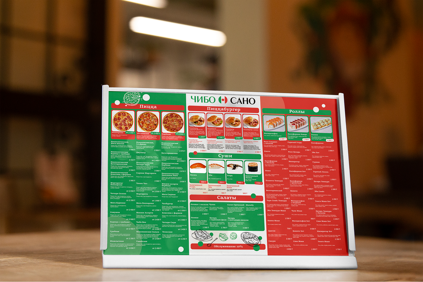 Проект «Чибо Сано» - ресторан в формате fast casual, где в одном меню объединены несколько «якорных» категорий: пицца, пиццабургеры, роллы, суши и салаты. Когда ассортимент большой, меню перестает быть просто перечнем позиций - оно становится навигацией, сценарием выбора и прямым инструментом продаж. В этом кейсе мы разработали печатное меню для зала и стойки, которое должно было одинаково хорошо работать в час пик, при слабом освещении и в условиях быстрого решения «что взять прямо сейчас».