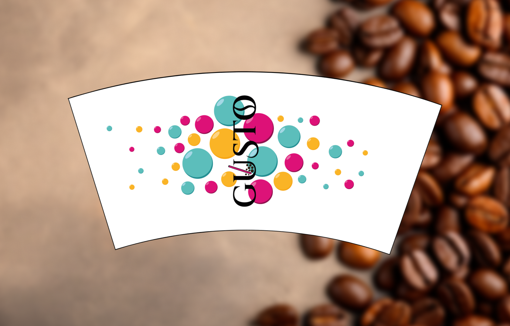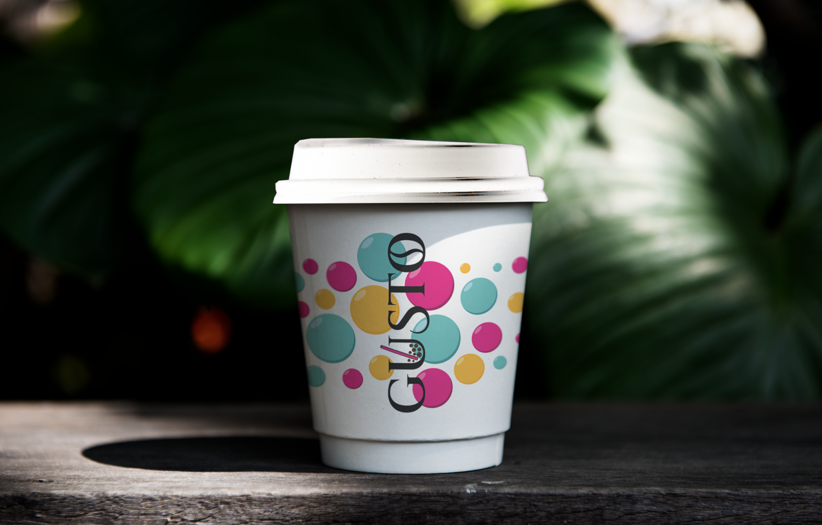Финальный дизайн упаковки для бренда Gusto — это белый стакан с яркими пузырями, окружающими логотип. На плоском макете видно, как элементы распределены для идеального обхвата, а в 3D-виде на деревянном столе с зелёным фоном упаковка выглядит живой и inviting. Такой подход не только усиливает брендинг кофе, но и повышает узнаваемость: потребители ассоциируют Gusto с позитивом и свежестью.