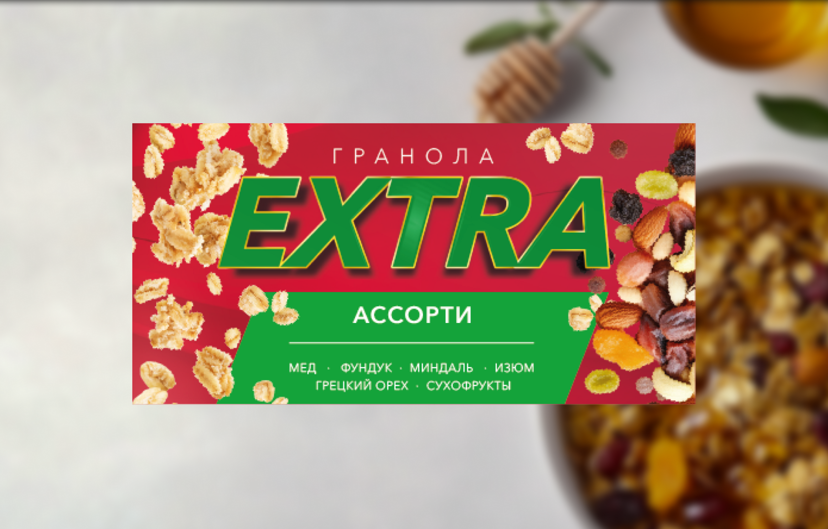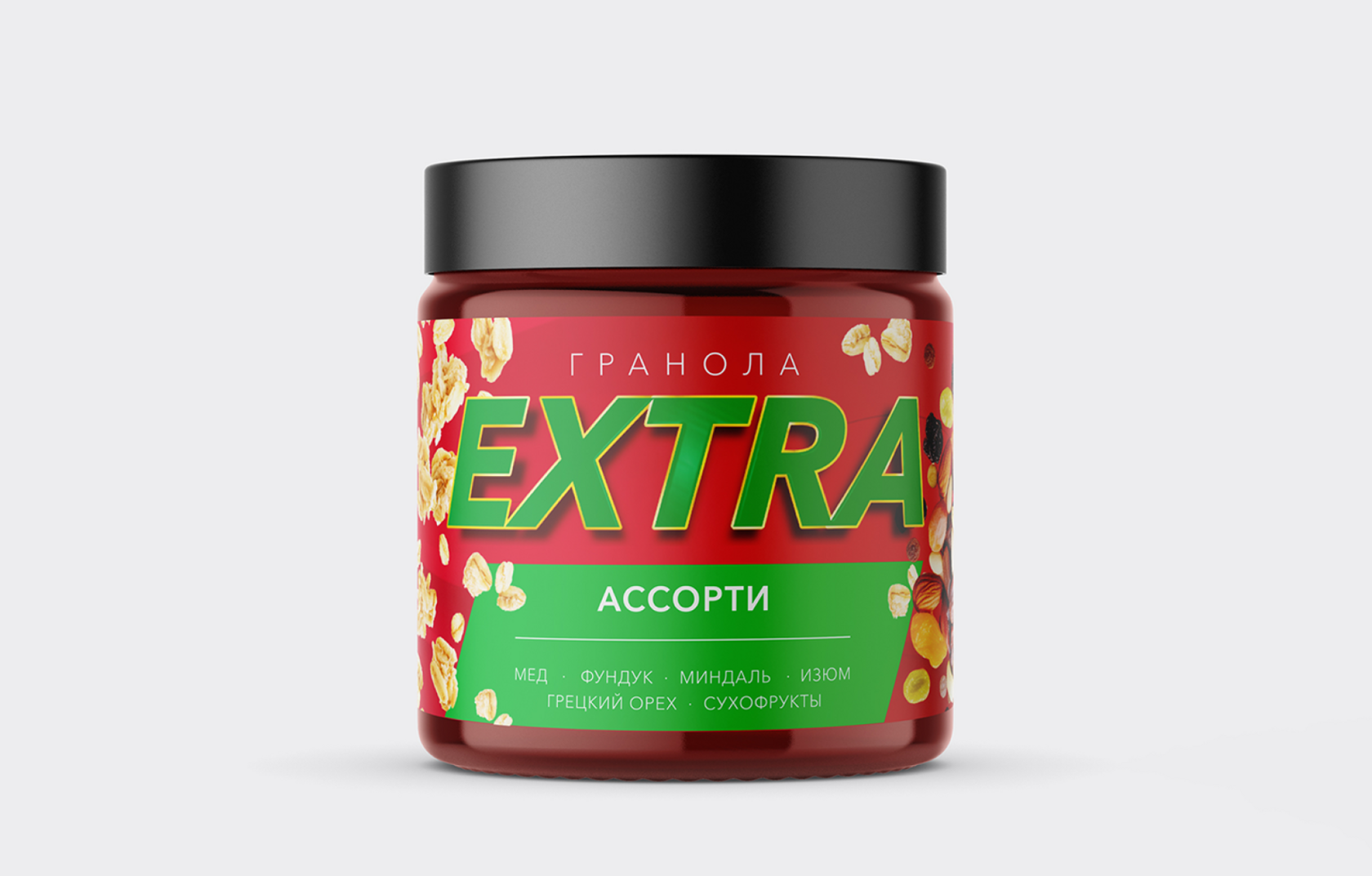 Финальный дизайн упаковки — это банка с красным фоном, усыпанным иллюстрациями хлопьев, орехов и фруктов. Название "Гранола Extra" в зелёном доминирует, а "Ассорти" на белом фоне добавляет акцент. Список ингредиентов ("Мёд, фундук, миндаль, изюм, грецкий орех, сухофрукты") размещён горизонтально, чтобы было удобно читать. Для баннера мы адаптировали дизайн, добавив размытый фон с миской гранолы, чтобы создать ощущение уюта и аппетита.